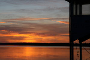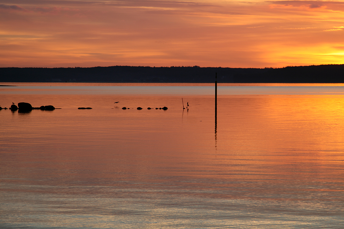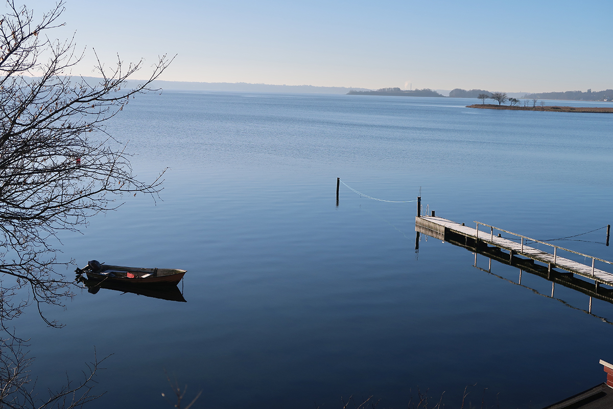 Ferienwohnung mit Ostseeblick: Kleiner Steg mit Holzboot im Wasser.